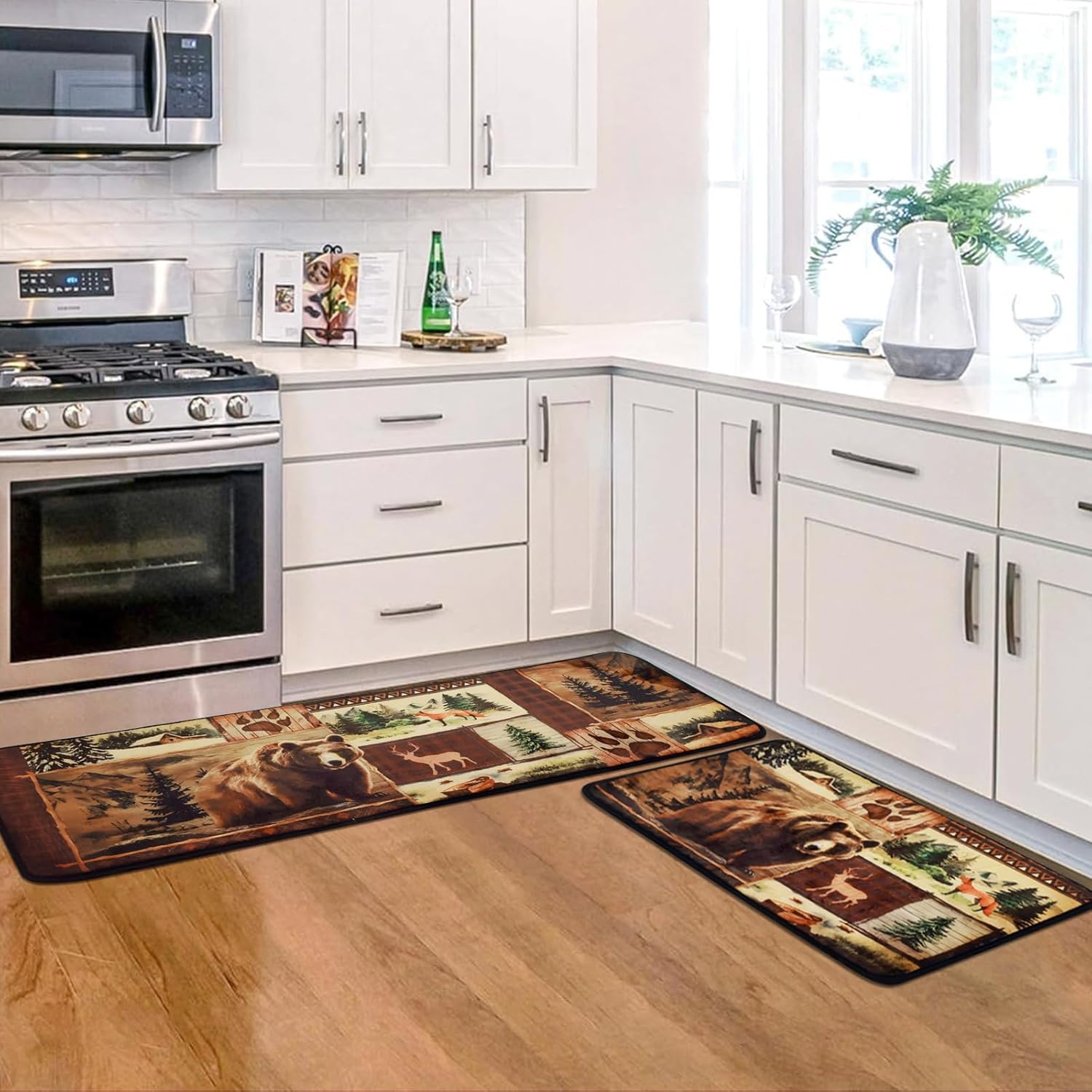 The country wildlife design adds a touch of charm to your kitchen or bathroom, making these mats both functional and stylish. Upgrade your space with the 2 Pieces Bear Kitchen Rugs today!