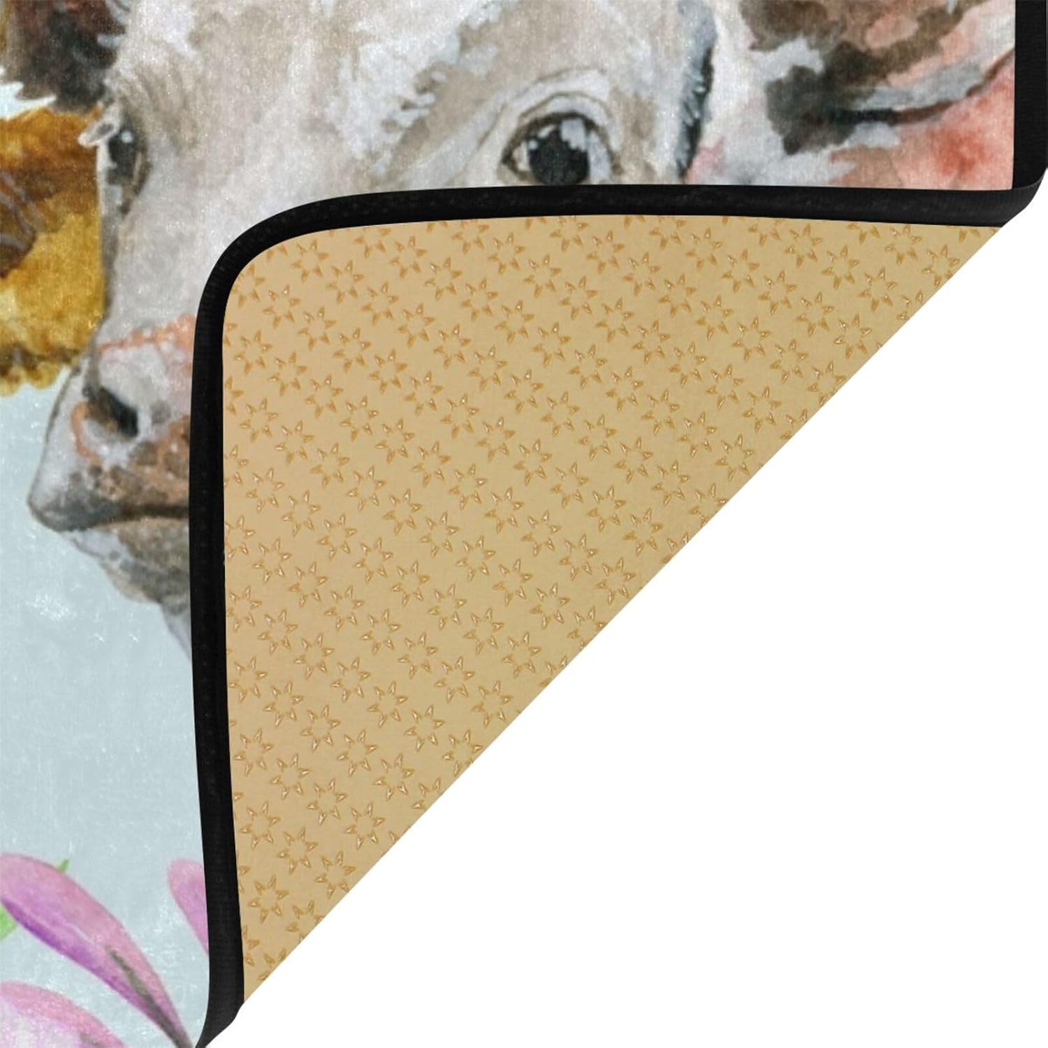 Made from absorbent materials, this mat is also great for use in the bathroom as a bath rug or in the entryway as a runner. The charming design features a playful pattern of cows, animals, and flowers, adding a touch of whimsy to any space.